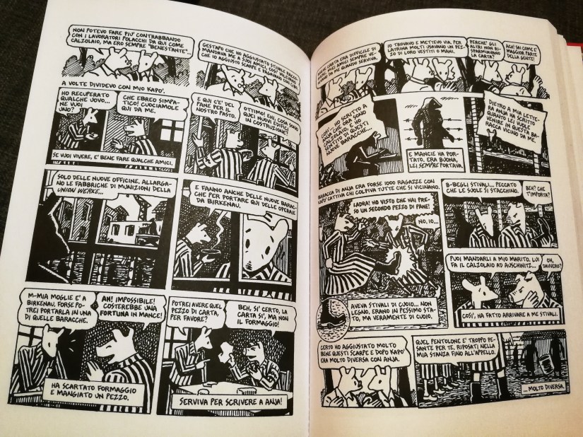 Il linguaggio, così come i disegni, è semplice. Credo che uno dei punti di assoluta forza di Maus, oltre agli eventi raccontati, sia proprio questo. È un libro che non vuole essere una lezione di storia o di etica ma, non si fa scrupoli a raccontare scene raccapriccianti successe davvero all’interno dei pogrom o dei campi di concentramento. La condanna dell’Olocausto qui non è filosofica, è quello che ha segnato per sempre l’esistenza della famiglia dell’autore.