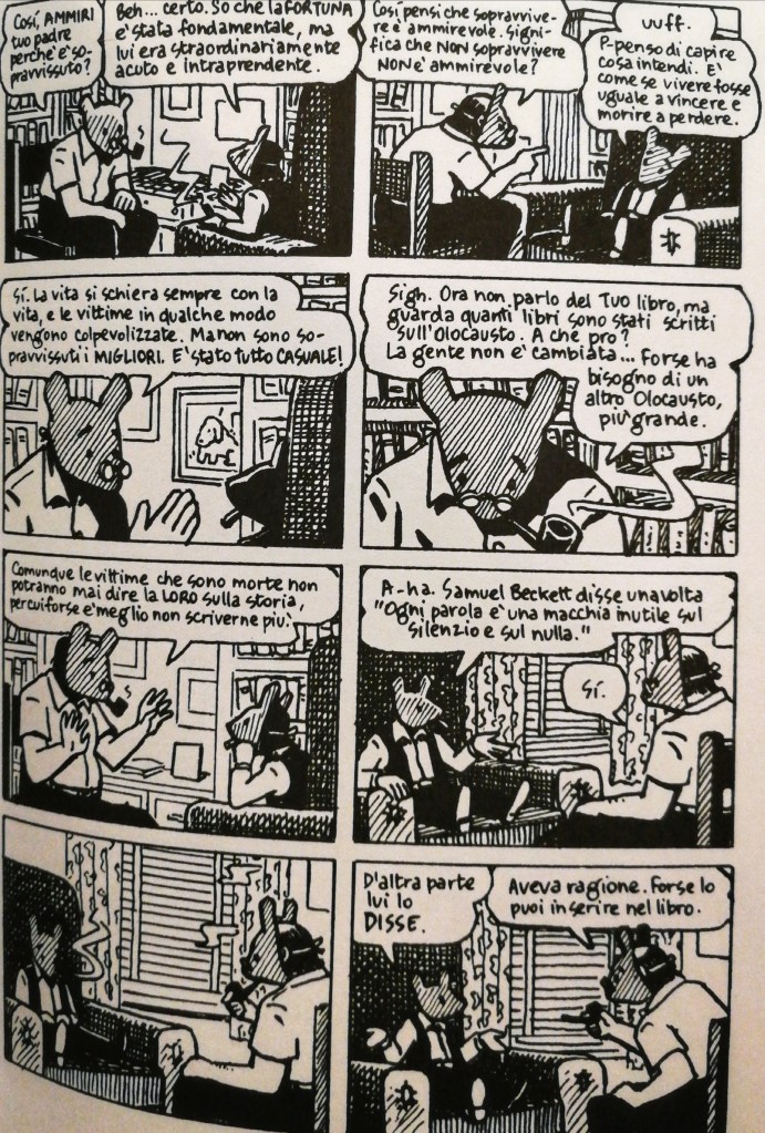 Ho ammirato tantissimo Spiegelman per la capacità con cui è riuscito a dipingersi e raccontarsi, con tono molto spesso autocritico e onesto. La figura materna invece, Anja, appare sempre come “un’immagine sacra”, bellissima ma remota, sconosciuta anche all’autore stesso che non riesce, con sua grande tristezza, a darle voce.